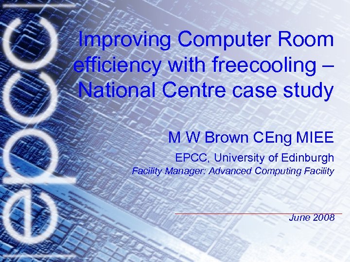 Improving Computer Room efficiency with freecooling – National Centre case study M W Brown CEng MIEE EPCC, University of Edinburgh Facility Manager: Advanced Computing Facility June 2008
