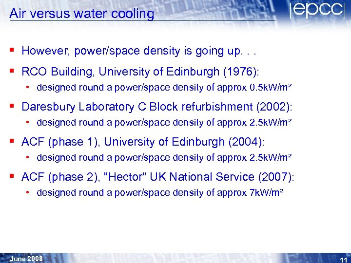Air versus water cooling § However, power/space density is going up. . . § RCO Building, University of Edinburgh (1976): • designed round a power/space density of approx 0. 5 k. W/m² § Daresbury Laboratory C Block refurbishment (2002): • designed round a power/space density of approx 2. 5 k. W/m² § ACF (phase 1), University of Edinburgh (2004): • designed round a power/space density of approx 2. 5 k. W/m² § ACF (phase 2), "Hector" UK National Service (2007): • designed round a power/space density of approx 7 k. W/m² June 2008 11