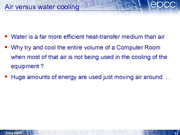 Air versus water cooling § Rack power is going up: • 2002: IBM p 690 (HPC-X UK National Service at Daresbury): 10 k. W per rack • 2007: Cray XT 4 ("hector" UK National Service at Edinburgh): 18 k. W per rack • 2008: Cray XT 5 (various HPC sites in US and elsewhere): 38 k. W per rack § This is now at (or beyond) the effective limits of direct aircooling § Suppliers now must either move towards efficient packaging with water-assisted cooling directly in the racking, or more radical methods of direct liquid cooling June 2008 12