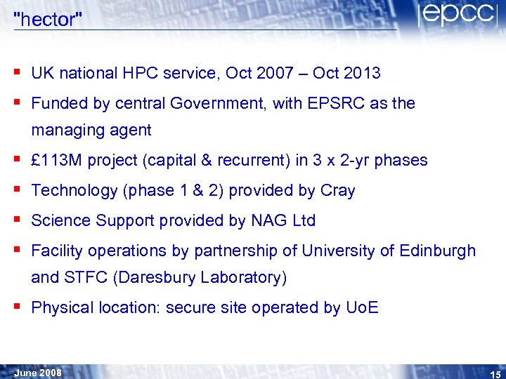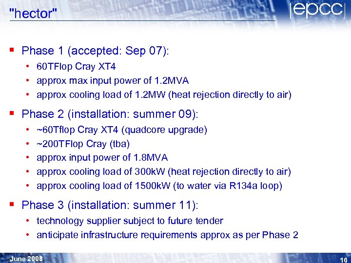"hector" § UK national HPC service, Oct 2007 – Oct 2013 § Funded by central Government, with EPSRC as the managing agent § § £ 113 M project (capital & recurrent) in 3 x 2 -yr phases Technology (phase 1 & 2) provided by Cray Science Support provided by NAG Ltd Facility operations by partnership of University of Edinburgh and STFC (Daresbury Laboratory) § Physical location: secure site operated by Uo. E June 2008 15