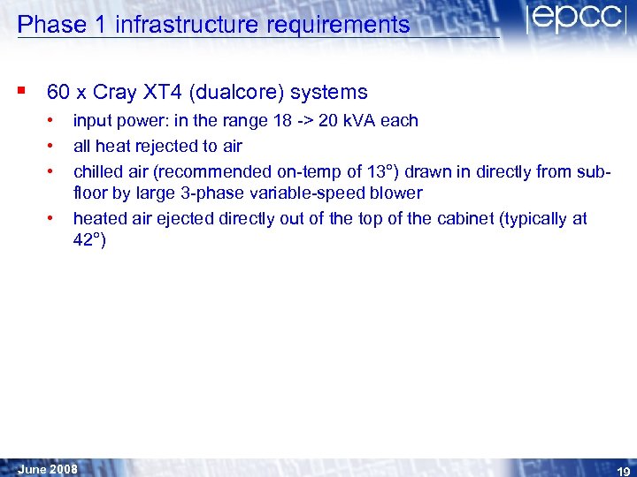 Phase 1 infrastructure requirements § 60 x Cray XT 4 (dualcore) systems • • input power: in the range 18 -> 20 k. VA each all heat rejected to air chilled air (recommended on-temp of 13°) drawn in directly from subfloor by large 3 -phase variable-speed blower heated air ejected directly out of the top of the cabinet (typically at 42°) June 2008 19