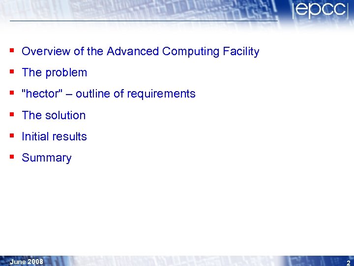 § § § Overview of the Advanced Computing Facility The problem "hector" – outline of requirements The solution Initial results Summary June 2008 2
