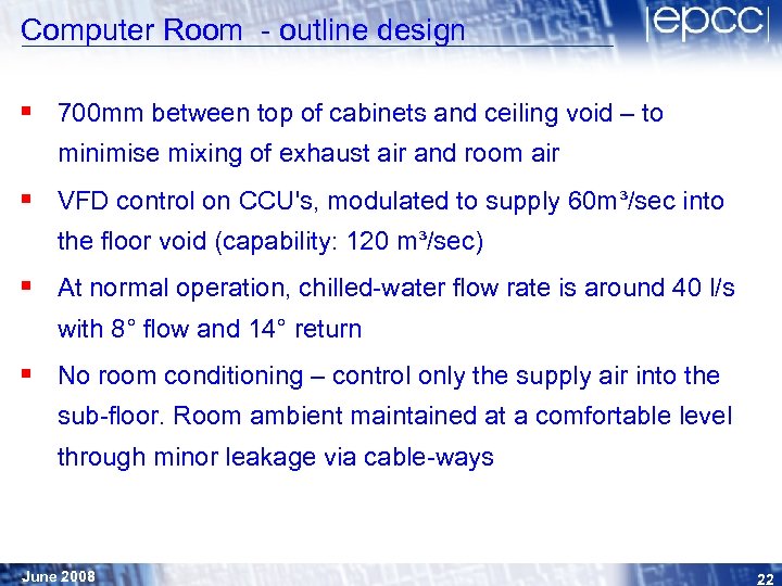 Computer room – outline design § Required infrastructure must be able to cope with both Phase 1 and Phase 2 cooling requirements § High-capacity chilled-water main supplying water at 8° to 14 x 80 k. W capacity CCU's set to supply air off-coil at 13° (+/0. 4°) § Valved connections installed for 12 x XDP HX units for Phase 2 § Install lowered ceiling designed to capture exhaust air from XT 4's, with inlets to CCU's ducted directly from ceiling void § Aim to maximise return air temp to widen Δt across coil and minimise interaction/mixing with room air June 2008 21