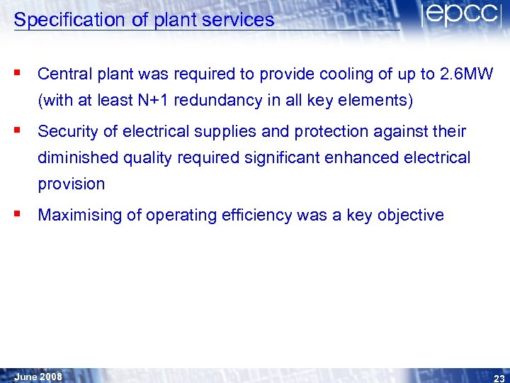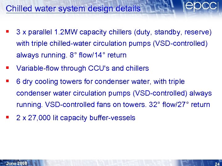 Specification of plant services § Central plant was required to provide cooling of up to 2. 6 MW (with at least N+1 redundancy in all key elements) § Security of electrical supplies and protection against their diminished quality required significant enhanced electrical provision § Maximising of operating efficiency was a key objective June 2008 23