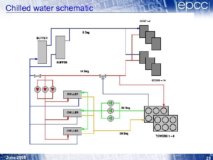 Chilled water system design details § 3 x parallel 1. 2 MW capacity chillers (duty, standby, reserve) with triple chilled-water circulation pumps (VSD-controlled) always running. 8° flow/14° return § Variable-flow through CCU's and chillers § 6 dry cooling towers for condenser water, with triple condenser water circulation pumps (VSD-controlled) always running. VSD-controlled fans on towers. 32° flow/27° return § 2 x 27, 000 lit capacity buffer-vessels June 2008 24