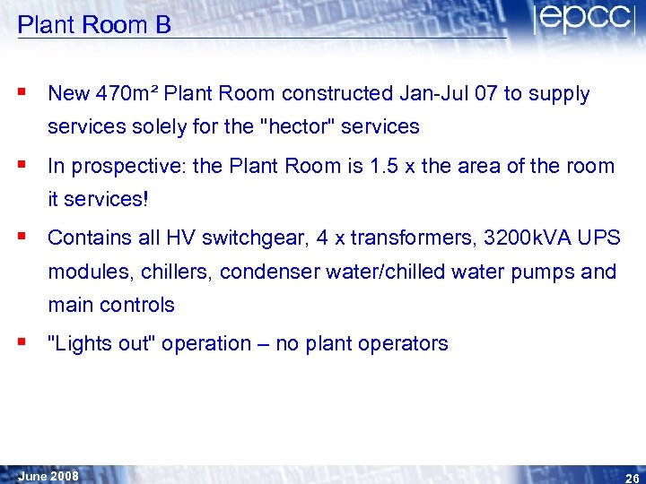 Plant Room B § New 470 m² Plant Room constructed Jan-Jul 07 to supply services solely for the "hector" services § In prospective: the Plant Room is 1. 5 x the area of the room it services! § Contains all HV switchgear, 4 x transformers, 3200 k. VA UPS modules, chillers, condenser water/chilled water pumps and main controls § "Lights out" operation – no plant operators June 2008 26