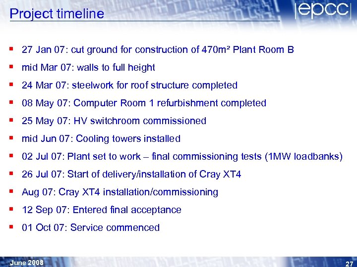 Project timeline § § § 27 Jan 07: cut ground for construction of 470 m² Plant Room B mid Mar 07: walls to full height 24 Mar 07: steelwork for roof structure completed 08 May 07: Computer Room 1 refurbishment completed 25 May 07: HV switchroom commissioned mid Jun 07: Cooling towers installed 02 Jul 07: Plant set to work – final commissioning tests (1 MW loadbanks) 26 Jul 07: Start of delivery/installation of Cray XT 4 Aug 07: Cray XT 4 installation/commissioning 12 Sep 07: Entered final acceptance 01 Oct 07: Service commenced June 2008 27