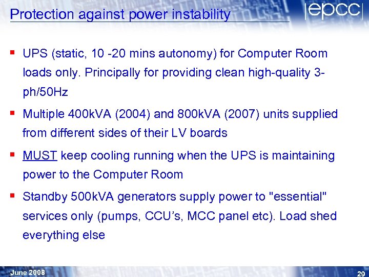 Protection against power instability § UPS (static, 10 -20 mins autonomy) for Computer Room loads only. Principally for providing clean high-quality 3 ph/50 Hz § Multiple 400 k. VA (2004) and 800 k. VA (2007) units supplied from different sides of their LV boards § MUST keep cooling running when the UPS is maintaining power to the Computer Room § Standby 500 k. VA generators supply power to "essential" services only (pumps, CCU’s, MCC panel etc). Load shed everything else June 2008 29