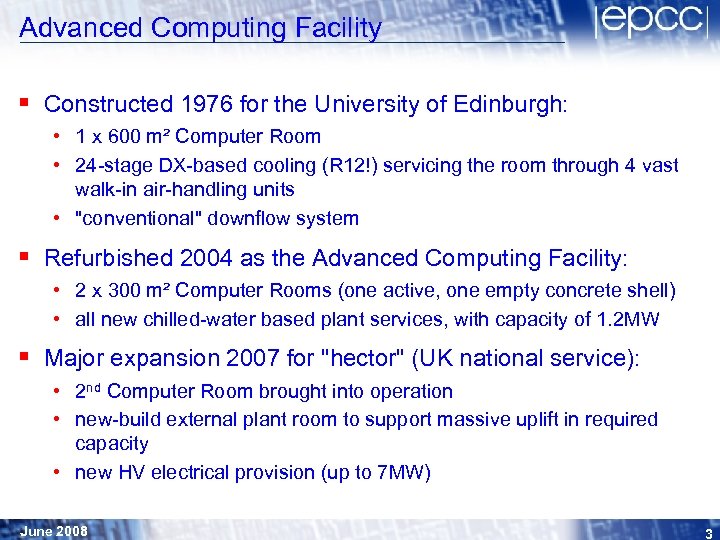 Advanced Computing Facility § Constructed 1976 for the University of Edinburgh: • 1 x 600 m² Computer Room • 24 -stage DX-based cooling (R 12!) servicing the room through 4 vast walk-in air-handling units • "conventional" downflow system § Refurbished 2004 as the Advanced Computing Facility: • 2 x 300 m² Computer Rooms (one active, one empty concrete shell) • all new chilled-water based plant services, with capacity of 1. 2 MW § Major expansion 2007 for "hector" (UK national service): • 2 nd Computer Room brought into operation • new-build external plant room to support massive uplift in required capacity • new HV electrical provision (up to 7 MW) June 2008 3