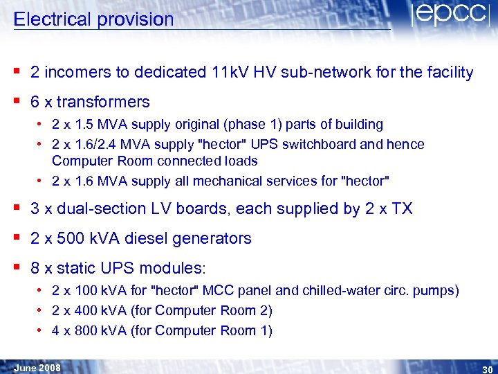 Electrical provision § 2 incomers to dedicated 11 k. V HV sub-network for the facility § 6 x transformers • 2 x 1. 5 MVA supply original (phase 1) parts of building • 2 x 1. 6/2. 4 MVA supply "hector" UPS switchboard and hence Computer Room connected loads • 2 x 1. 6 MVA supply all mechanical services for "hector" § 3 x dual-section LV boards, each supplied by 2 x TX § 2 x 500 k. VA diesel generators § 8 x static UPS modules: • 2 x 100 k. VA for "hector" MCC panel and chilled-water circ. pumps) • 2 x 400 k. VA (for Computer Room 2) • 4 x 800 k. VA (for Computer Room 1) June 2008 30