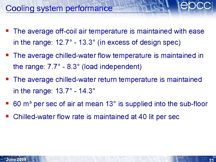 Cooling system performance § The average off-coil air temperature is maintained with ease in the range: 12. 7° - 13. 3° (in excess of design spec) § The average chilled-water flow temperature is maintained in the range: 7. 7° - 8. 3° (load independent) § The average chilled-water return temperature is maintained in the range: 13. 7° - 14. 3° § 60 m³ per sec of air at mean 13° is supplied into the sub-floor § Chilled-water flow rate is maintained at 40 lit per sec June 2008 31