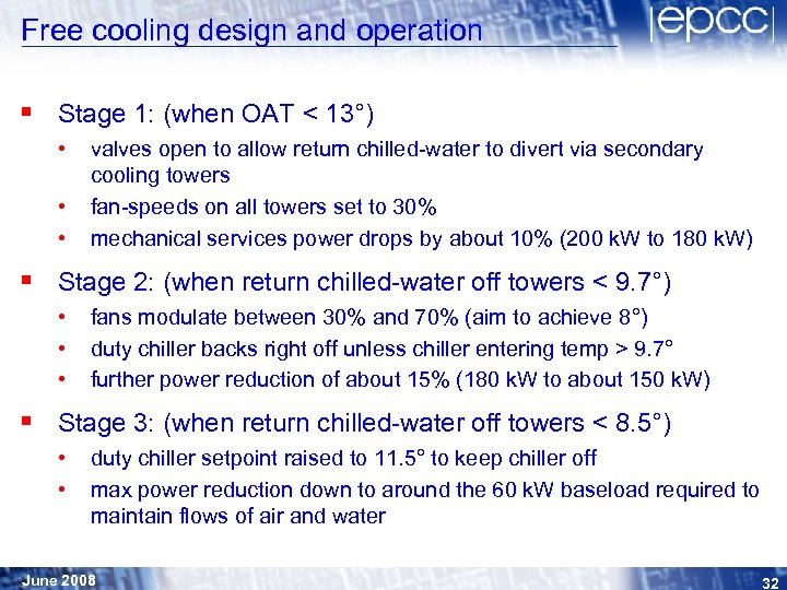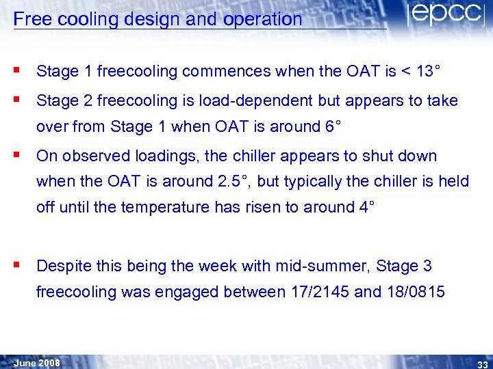 Free cooling design and operation § Stage 1: (when OAT < 13°) • • • valves open to allow return chilled-water to divert via secondary cooling towers fan-speeds on all towers set to 30% mechanical services power drops by about 10% (200 k. W to 180 k. W) § Stage 2: (when return chilled-water off towers < 9. 7°) • • • fans modulate between 30% and 70% (aim to achieve 8°) duty chiller backs right off unless chiller entering temp > 9. 7° further power reduction of about 15% (180 k. W to about 150 k. W) § Stage 3: (when return chilled-water off towers < 8. 5°) • • duty chiller setpoint raised to 11. 5° to keep chiller off max power reduction down to around the 60 k. W baseload required to maintain flows of air and water June 2008 32