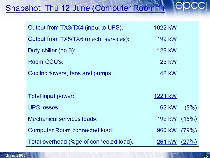 Snapshot: Thu 12 June (Computer Room 1) Output from TX 3/TX 4 (input to UPS): 1022 k. W Output from TX 5/TX 6 (mech. services): 199 k. W Duty chiller (no 3): 128 k. W Room CCU's: 23 k. W Cooling towers, fans and pumps: 48 k. W Total input power: UPS losses: 1221 k. W 62 k. W (5%) Mechanical services loads: Computer Room connected load: 960 k. W (79%) Total overhead (%ge of connected load): June 2008 199 k. W (16%) 261 k. W (27%) 35