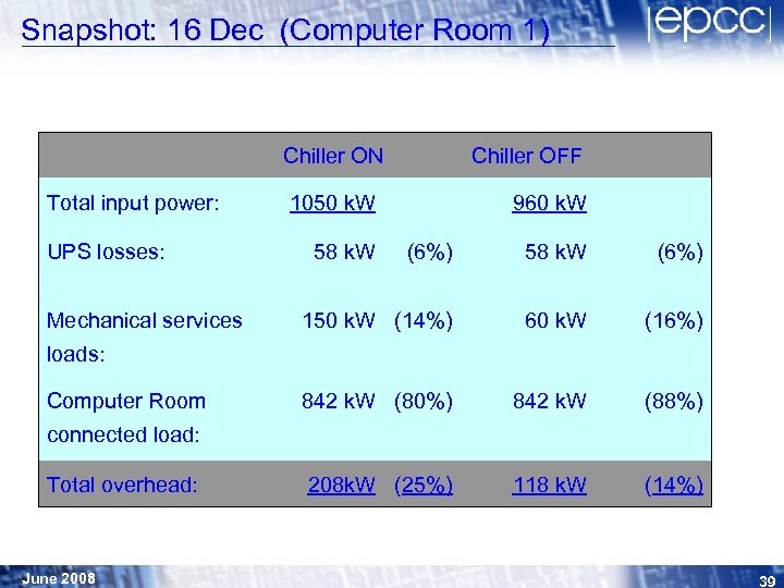 Snapshot: 16 Dec (Computer Room 1) Chiller ON Total input power: UPS losses: Mechanical services Chiller OFF 1050 k. W 58 k. W 960 k. W (6%) 58 k. W (6%) 150 k. W (14%) 60 k. W (16%) 842 k. W (80%) 842 k. W (88%) 208 k. W (25%) 118 k. W (14%) loads: Computer Room connected load: Total overhead: June 2008 39
