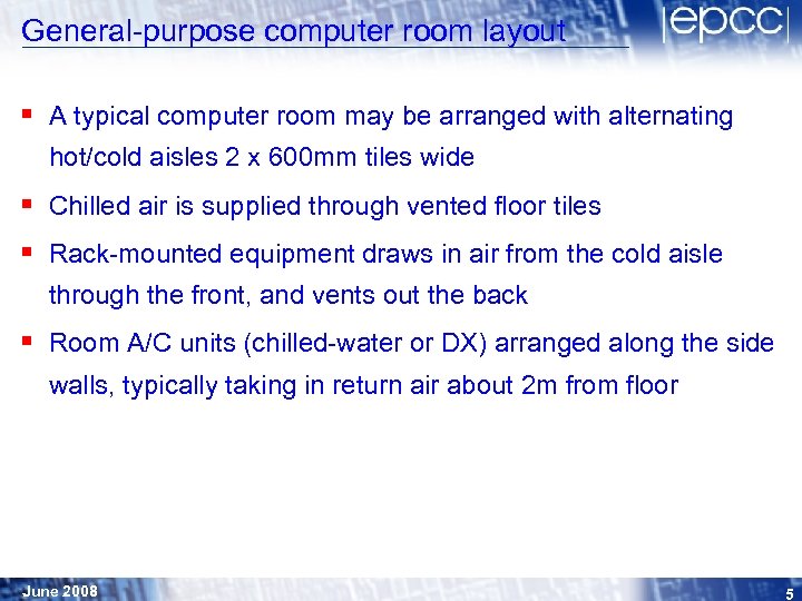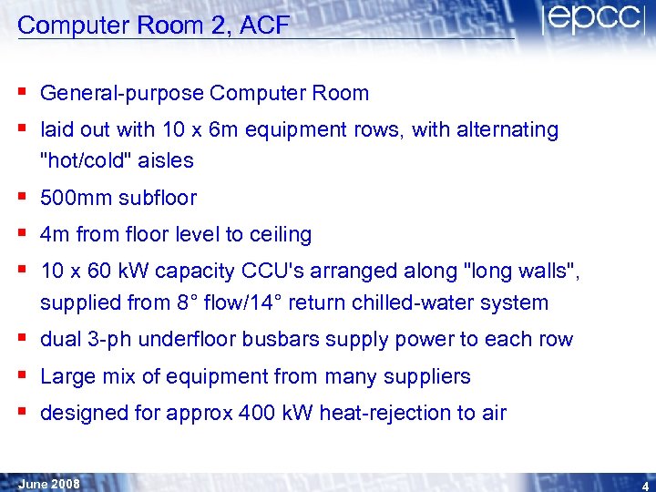 Computer Room 2, ACF § General-purpose Computer Room § laid out with 10 x 6 m equipment rows, with alternating "hot/cold" aisles § 500 mm subfloor § 4 m from floor level to ceiling § 10 x 60 k. W capacity CCU's arranged along "long walls", supplied from 8° flow/14° return chilled-water system § dual 3 -ph underfloor busbars supply power to each row § Large mix of equipment from many suppliers § designed for approx 400 k. W heat-rejection to air June 2008 4