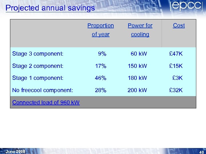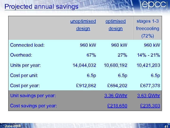 Projected annual savings Proportion Power for Cost of year cooling Stage 3 component: 9% 60 k. W £ 47 K Stage 2 component: 17% 150 k. W £ 15 K Stage 1 component: 46% 180 k. W £ 3 K No freecool component: 28% 200 k. W £ 32 K Connected load of 960 k. W June 2008 40