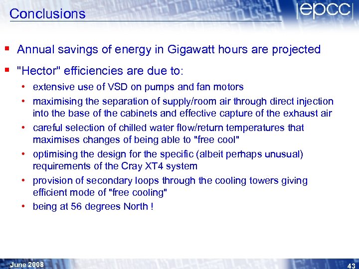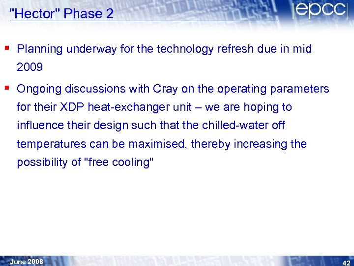 "Hector" Phase 2 § Planning underway for the technology refresh due in mid 2009 § Ongoing discussions with Cray on the operating parameters for their XDP heat-exchanger unit – we are hoping to influence their design such that the chilled-water off temperatures can be maximised, thereby increasing the possibility of "free cooling" June 2008 42