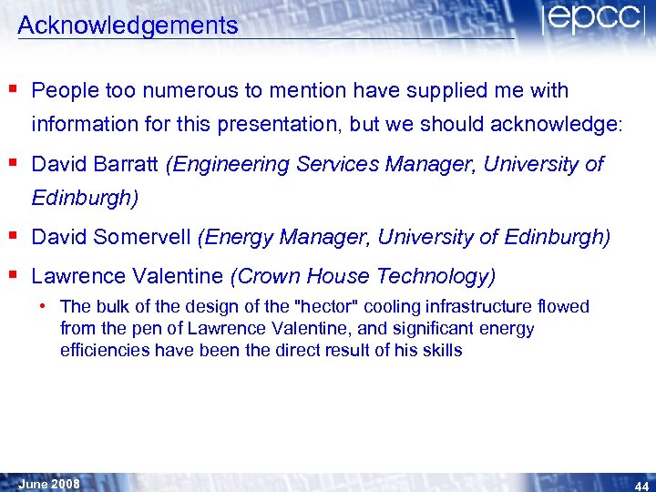 Conclusions § Annual savings of energy in Gigawatt hours are projected § "Hector" efficiencies are due to: • extensive use of VSD on pumps and fan motors • maximising the separation of supply/room air through direct injection into the base of the cabinets and effective capture of the exhaust air • careful selection of chilled water flow/return temperatures that maximises changes of being able to "free cool" • optimising the design for the specific (albeit perhaps unusual) requirements of the Cray XT 4 system • provision of secondary loops through the cooling towers giving efficient mode of "free cooling" • being at 56 degrees North ! June 2008 43