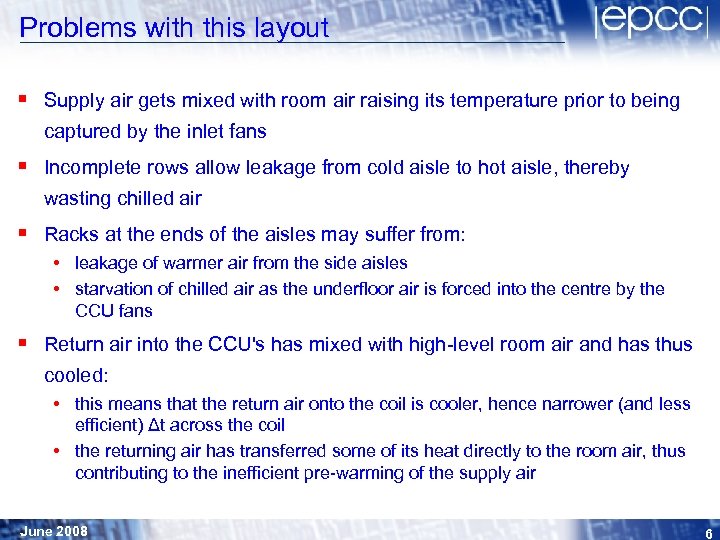 General-purpose computer room layout § A typical computer room may be arranged with alternating hot/cold aisles 2 x 600 mm tiles wide § Chilled air is supplied through vented floor tiles § Rack-mounted equipment draws in air from the cold aisle through the front, and vents out the back § Room A/C units (chilled-water or DX) arranged along the side walls, typically taking in return air about 2 m from floor June 2008 5