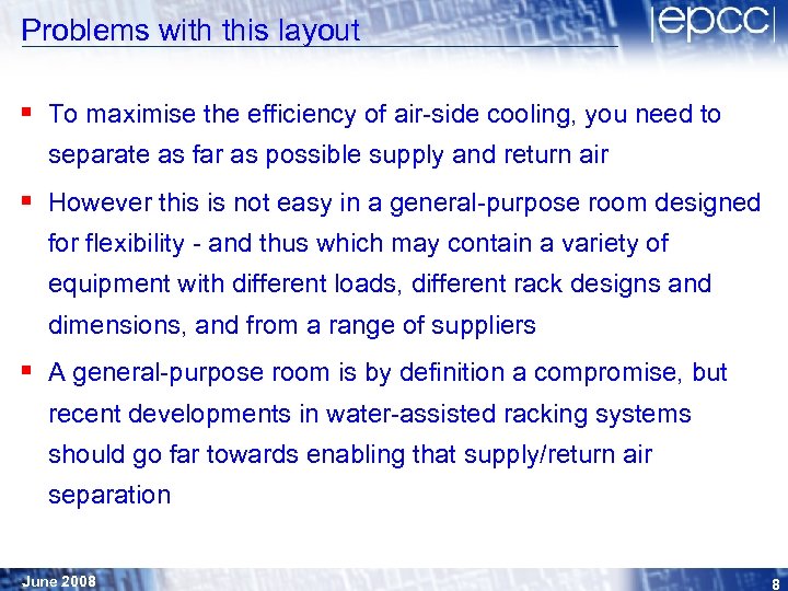 Problems with this layout § Recent measurements at ACF Computer Room 2 (conventional layout): § § Cold aisle temps (midway) in the range: 16. 4° to 18. 5° Hot aisle temps (midway) in the range: 26. 5° to 31. 2° Side aisle just 1 tile (600 mm) off end of cold aisle: 20. 4° CCU inlet temps (2. 2 m off ground): mean of 24° June 2008 7