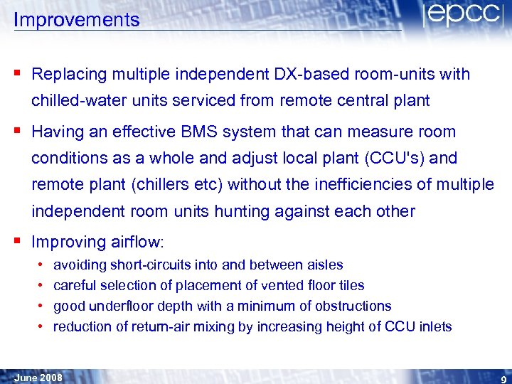 Improvements § Replacing multiple independent DX-based room-units with chilled-water units serviced from remote central plant § Having an effective BMS system that can measure room conditions as a whole and adjust local plant (CCU's) and remote plant (chillers etc) without the inefficiencies of multiple independent room units hunting against each other § Improving airflow: • • avoiding short-circuits into and between aisles careful selection of placement of vented floor tiles good underfloor depth with a minimum of obstructions reduction of return-air mixing by increasing height of CCU inlets June 2008 9