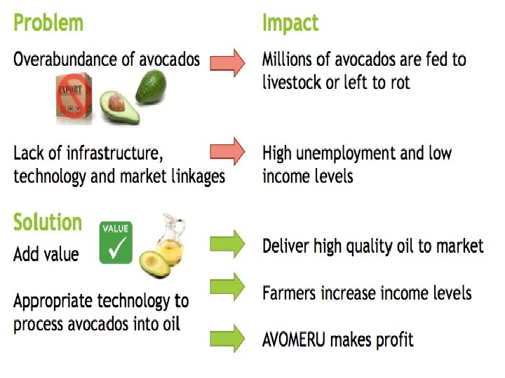 The Case of AVOMERO Group in Meru District • A field study conducted through visiting some avocado processing plants in Meru District, Arusha Region, led to accessing of very interesting information. • A person known as Mr. Jesse J. Olyjange had taken some initiatives to set up an avocado processing plant in the district. • His idea was largely stimulated after he attended training of entrepreneurship and product design at MIT in the USA in 2012 where problem solving skills were imparted. • The training demanded trainees to come up with a problem solving idea from their communities. • Consequently, he perceived avocado processing as one of the problems constraining avocado farmers in Meru District and then graphically presented his idea as follows: