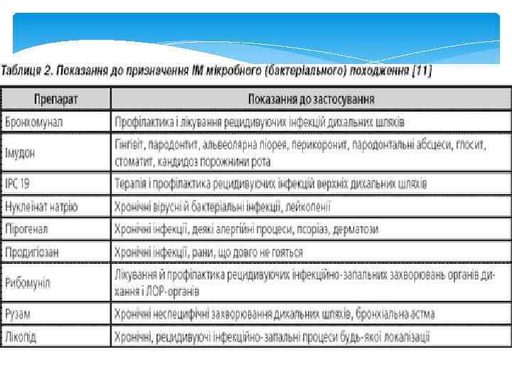 Імуномодулятори мікробного (бактеріального) походження Мішенню дії препаратів мікробного походження є клітини моноцитарно-макрофагальної системи, основна функція яких — елімінація мікробів з організму. Препарати даної групи: — підсилюють функціональну активність цих клітин, стимулюючи фагоцитоз і мікробіцидність. Активовані моноцити й макрофаги синтезують цитокіни: інтерлейкіни (ІЛ-1, ІЛ-3), фактор некрозу пухлини α (ФНП-α) та інші, що спричинюють активацію як гуморальної, так і клітинної ланки імунітету; — активують цитотоксичну функцію макрофагів, що виявляється їх здатністю руйнувати in vitro пухлинні клітини. Бактеріальні ІМ поділяють на: 1. ІМ системної дії: бронхомунал, рибомуніл, лікопід. 2. ІМ переважно топічної дії: ІРС 19, імудон, лікопід