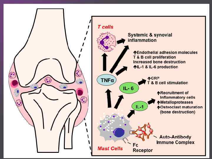 Відповідно до сучасної наукової концепції основу патогенезу РА становлять складні дефекти Т-клітинної імунорегуляції та В-клітинної толерантності, що в результаті приводять до переваги синтезу прозапальних цитокінів (фактора некрозу пухлин (ФНП)-α, інтерлейкінів (ІЛ)-6, -17 та ін. ) над протизапальними цитокінами (ІЛ-10 та ін. ) [3]. На сьогодні важливу увагу науковці приділяють вивченню ІЛ-6 — плейотропного цитокіну, який має широкий спектр прозапальних біологічних ефектів. Доведено значення ІЛ-6 у розвитку РА порівняно з іншими прозапальними цитокінами