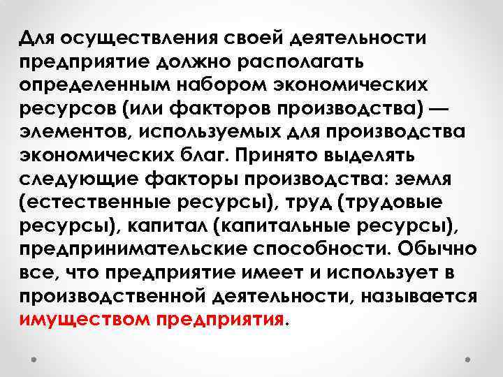Для осуществления своей деятельности предприятие должно располагать определенным набором экономических ресурсов (или факторов производства) — элементов, используемых для производства экономических благ. Принято выделять следующие факторы производства: земля (естественные ресурсы), труд (трудовые ресурсы), капитал (капитальные ресурсы), предпринимательские способности. Обычно все, что предприятие имеет и использует в производственной деятельности, называется имуществом предприятия.