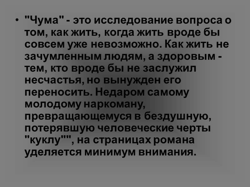 "Чума" - это исследование вопроса о том, как жить, когда жить вроде бы совсем уже невозможно. Как жить не зачумленным людям, а здоровым - тем, кто вроде бы не заслужил несчастья, но вынужден его переносить. Недаром самому молодому наркоману, превращающемуся в бездушную, потерявшую человеческие черты "куклу"", на страницах романа уделяется минимум внимания.