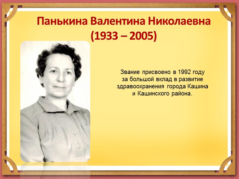 Панькина Валентина Николаевна (1933 – 2005) Звание присвоено в 1992 году за большой вклад в развитие здравоохранения города Кашина и Кашинского района.