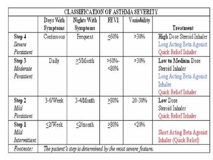• Add inhaled long-acting 2 agonists rather than increasing the dose of inhaled steroids (above 800 mcg/day in adults and 400 mcg/day in children) • Step down therapy to lowest level consistent with maintained control