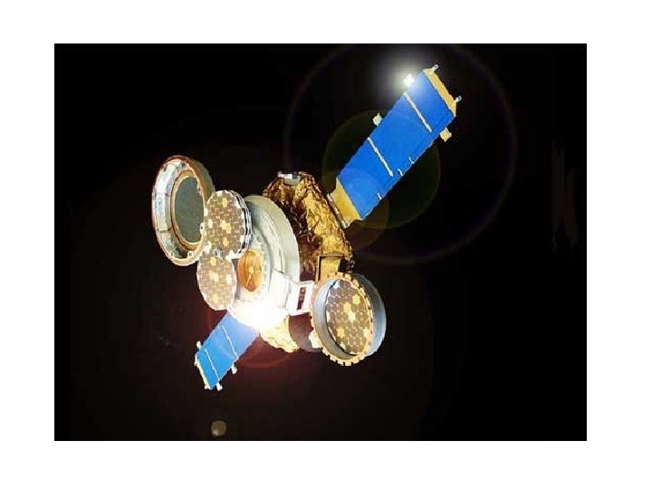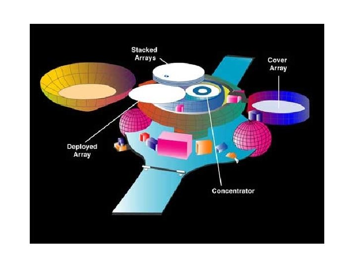 The Genesis spacecraft opened for collection of solar wind. • This artist's conception of the Genesis spacecraft shows it in full operational mode, opened up to collect and store samples of solar wind particles. • The cover of the science canister, shown on the right, contains one set of collection materials. It is the same kind of hexagonal silicon wafer array that comprises the stack of four arrays that were rotated out of the interior of the canister when the spacecraft began to orbit L 1. • The bottom three of the stacked arrays are controlled independently, and may be rotated out from the cover of the top of the stack to collect particular types of solar wind. • Inside the canister is an electrostatic concentrator to increase the collection of lightweight solar wind particles. It is exposed when the array stack is rotated out. • The two solar panels, shown in blue in this drawing, which extend to the side of the spacecraft bus, provide electrical energy for the functions performed by the rest of the spacecraft. • The two balls, shown in pink in this drawing, which sit at the sides of the spacecraft contain fuel for the small thruster rockets that maintain the Genesis spacecraft's orientation facing the Sun during its collection phase.