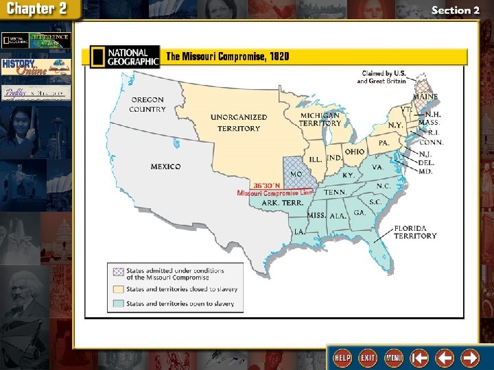 I. The Resurgence of Sectionalism (pages 183– 186) A. In 1819 Missouri applied for statehood as a slave state. This set off the divisive issue as to whether slavery should expand westward. The Union had 11 free states and 11 slave states. Admitting any new state, either slave or free, would upset the balance of political power in the Senate. B. The Missouri Compromise called for admitting Maine as a free state and Missouri as a slave state. An amendment was added to the compromise that prohibited slavery in the Louisiana Territory north of Missouri’s southern border. Henry Clay steered the compromise, and the House of Representatives accepted it.