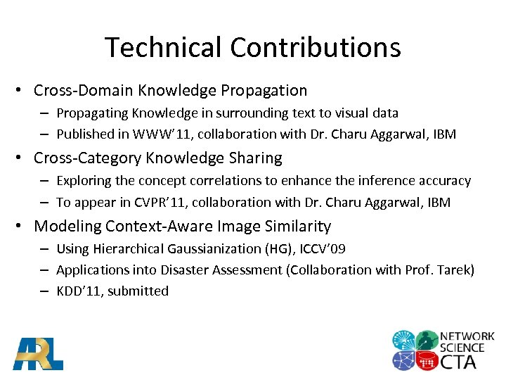 Technical Contributions • Cross-Domain Knowledge Propagation – Propagating Knowledge in surrounding text to visual data – Published in WWW’ 11, collaboration with Dr. Charu Aggarwal, IBM • Cross-Category Knowledge Sharing – Exploring the concept correlations to enhance the inference accuracy – To appear in CVPR’ 11, collaboration with Dr. Charu Aggarwal, IBM • Modeling Context-Aware Image Similarity – Using Hierarchical Gaussianization (HG), ICCV’ 09 – Applications into Disaster Assessment (Collaboration with Prof. Tarek) – KDD’ 11, submitted