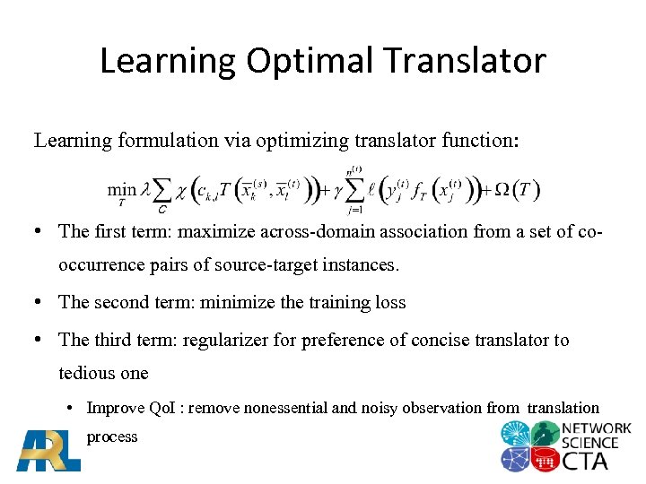 Learning Optimal Translator Learning formulation via optimizing translator function: • The first term: maximize across-domain association from a set of cooccurrence pairs of source-target instances. • The second term: minimize the training loss • The third term: regularizer for preference of concise translator to tedious one • Improve Qo. I : remove nonessential and noisy observation from translation process