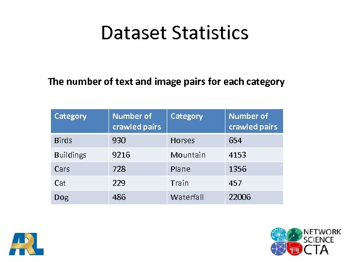 Dataset Statistics The number of text and image pairs for each category Category Number of crawled pairs Birds 930 Horses 654 Buildings 9216 Mountain 4153 Cars 728 Plane 1356 Cat 229 Train 457 Dog 486 Waterfall 22006