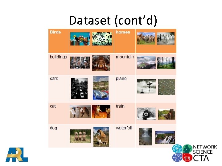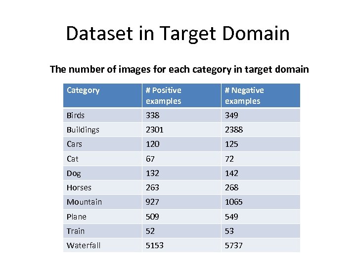 Dataset in Target Domain The number of images for each category in target domain Category # Positive examples # Negative examples Birds 338 349 Buildings 2301 2388 Cars 120 125 Cat 67 72 Dog 132 142 Horses 263 268 Mountain 927 1065 Plane 509 549 Train 52 53 Waterfall 5153 5737