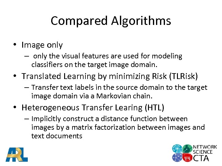 Compared Algorithms • Image only – only the visual features are used for modeling classifiers on the target image domain. • Translated Learning by minimizing Risk (TLRisk) – Transfer text labels in the source domain to the target image domain via a Markovian chain. • Heterogeneous Transfer Learing (HTL) – Implicitly construct a distance function between images by a matrix factorization between images and text documents