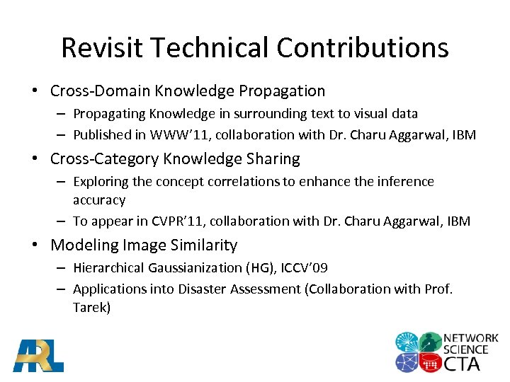 Revisit Technical Contributions • Cross-Domain Knowledge Propagation – Propagating Knowledge in surrounding text to visual data – Published in WWW’ 11, collaboration with Dr. Charu Aggarwal, IBM • Cross-Category Knowledge Sharing – Exploring the concept correlations to enhance the inference accuracy – To appear in CVPR’ 11, collaboration with Dr. Charu Aggarwal, IBM • Modeling Image Similarity – Hierarchical Gaussianization (HG), ICCV’ 09 – Applications into Disaster Assessment (Collaboration with Prof. Tarek)