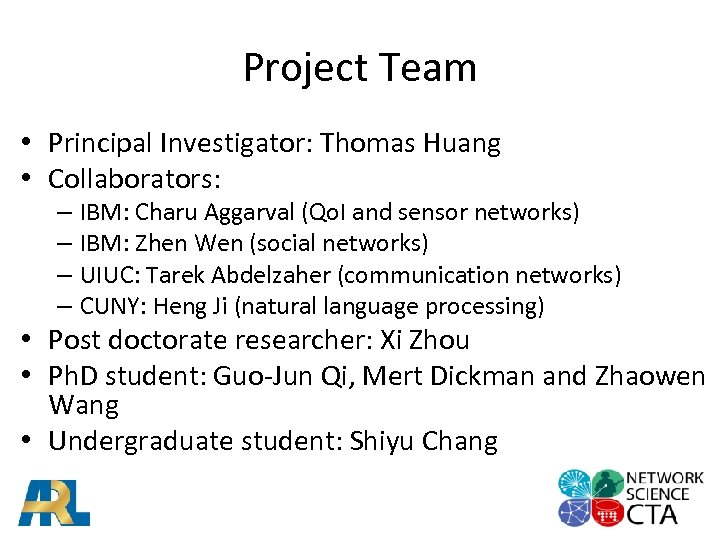 Project Team • Principal Investigator: Thomas Huang • Collaborators: – IBM: Charu Aggarval (Qo. I and sensor networks) – IBM: Zhen Wen (social networks) – UIUC: Tarek Abdelzaher (communication networks) – CUNY: Heng Ji (natural language processing) • Post doctorate researcher: Xi Zhou • Ph. D student: Guo-Jun Qi, Mert Dickman and Zhaowen Wang • Undergraduate student: Shiyu Chang