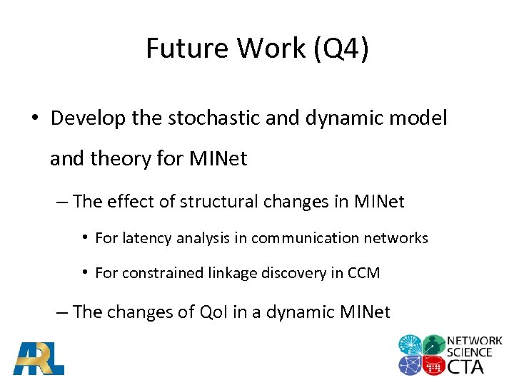 Future Work (Q 4) • Develop the stochastic and dynamic model and theory for MINet – The effect of structural changes in MINet • For latency analysis in communication networks • For constrained linkage discovery in CCM – The changes of Qo. I in a dynamic MINet