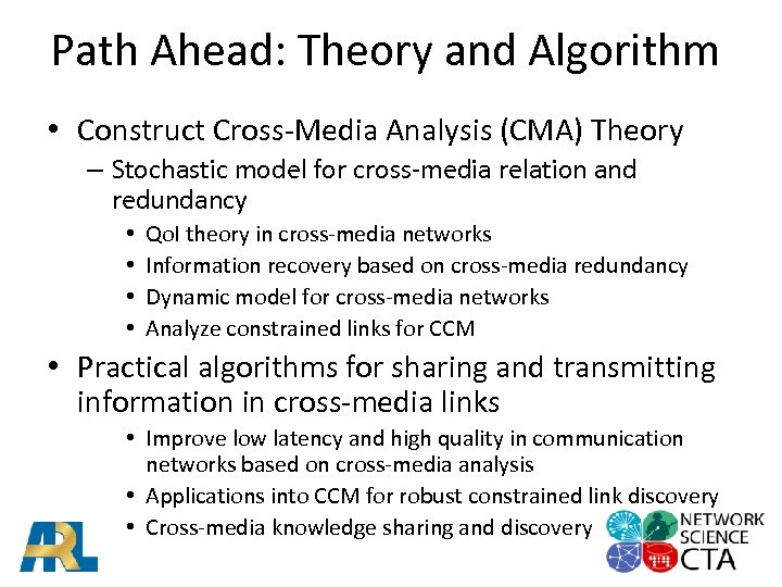 Path Ahead: Theory and Algorithm • Construct Cross-Media Analysis (CMA) Theory – Stochastic model for cross-media relation and redundancy • • Qo. I theory in cross-media networks Information recovery based on cross-media redundancy Dynamic model for cross-media networks Analyze constrained links for CCM • Practical algorithms for sharing and transmitting information in cross-media links • Improve low latency and high quality in communication networks based on cross-media analysis • Applications into CCM for robust constrained link discovery • Cross-media knowledge sharing and discovery