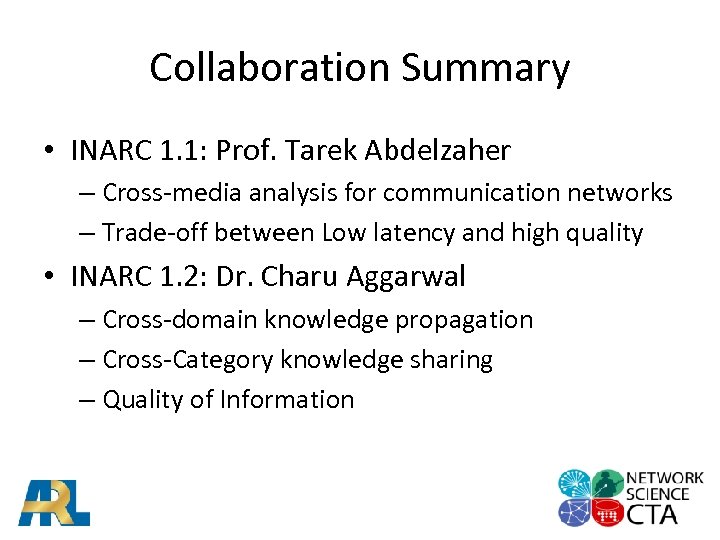 Collaboration Summary • INARC 1. 1: Prof. Tarek Abdelzaher – Cross-media analysis for communication networks – Trade-off between Low latency and high quality • INARC 1. 2: Dr. Charu Aggarwal – Cross-domain knowledge propagation – Cross-Category knowledge sharing – Quality of Information