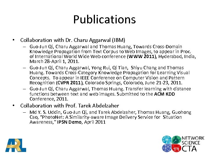 Publications • Collaboration with Dr. Charu Aggarwal (IBM) – Guo-Jun Qi, Charu Aggarwal and Thomas Huang, Towards Cross-Domain Knowledge Propagation from Text Corpus to Web Images, to appear in Proc. of International World Wide Web conference (WWW 2011), Hyderabad, India, March 28 -April 1, 2011. – Guo-Jun Qi, Charu Aggarwal, Yong Rui, Qi Tian, Shiyu Chang and Thomas Huang. Towards Cross-Category Knowledge Propagation for Learning Visual Concepts. To appear in IEEE Conference on Computer Vision and Pattern Recognition (CVPR 2011), Colorado Springs, Colorado, June 21 -23, 2011. – Guo-Jun Qi, Charu Aggarwal, Thomas Huang. Transfer learning with distance functions between text and web images. Submitted to the ACM KDD Conference, 2011. • Collaboration with Prof. Tarek Abdelzaher – Md Y. S. Uddin, Guo-Jun Qi, and Tarek Abdelzaher, Thomas Huang, Guohong Cao, “Photo. Net: A Similarity-aware Image Delivery Service for Situation Awareness, ” IPSN Demo, April 2011