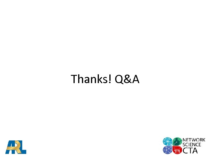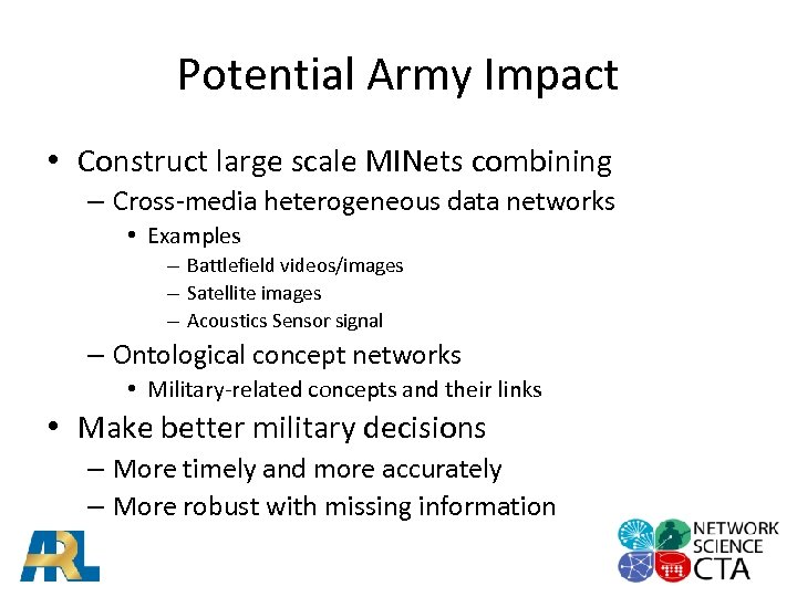 Potential Army Impact • Construct large scale MINets combining – Cross-media heterogeneous data networks • Examples – Battlefield videos/images – Satellite images – Acoustics Sensor signal – Ontological concept networks • Military-related concepts and their links • Make better military decisions – More timely and more accurately – More robust with missing information
