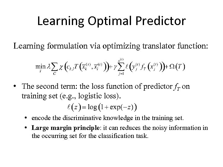 Learning Optimal Predictor Learning formulation via optimizing translator function: • The second term: the loss function of predictor f. T on training set (e. g. , logistic loss). • encode the discriminative knowledge in the training set. • Large margin principle: it can reduces the noisy information in the occurring set for the classification task.