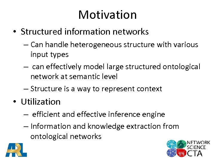 Motivation • Structured information networks – Can handle heterogeneous structure with various input types – can effectively model large structured ontological network at semantic level – Structure is a way to represent context • Utilization – efficient and effective inference engine – Information and knowledge extraction from ontological networks