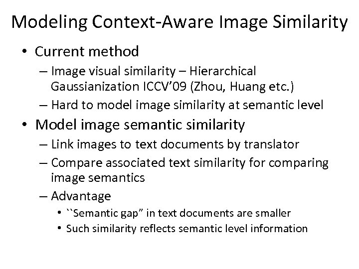 Modeling Context-Aware Image Similarity • Current method – Image visual similarity – Hierarchical Gaussianization ICCV’ 09 (Zhou, Huang etc. ) – Hard to model image similarity at semantic level • Model image semantic similarity – Link images to text documents by translator – Compare associated text similarity for comparing image semantics – Advantage • ``Semantic gap” in text documents are smaller • Such similarity reflects semantic level information