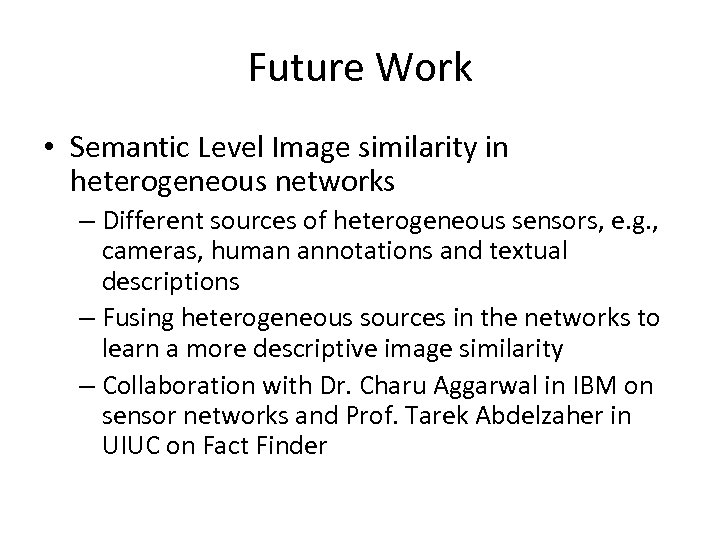 Future Work • Semantic Level Image similarity in heterogeneous networks – Different sources of heterogeneous sensors, e. g. , cameras, human annotations and textual descriptions – Fusing heterogeneous sources in the networks to learn a more descriptive image similarity – Collaboration with Dr. Charu Aggarwal in IBM on sensor networks and Prof. Tarek Abdelzaher in UIUC on Fact Finder